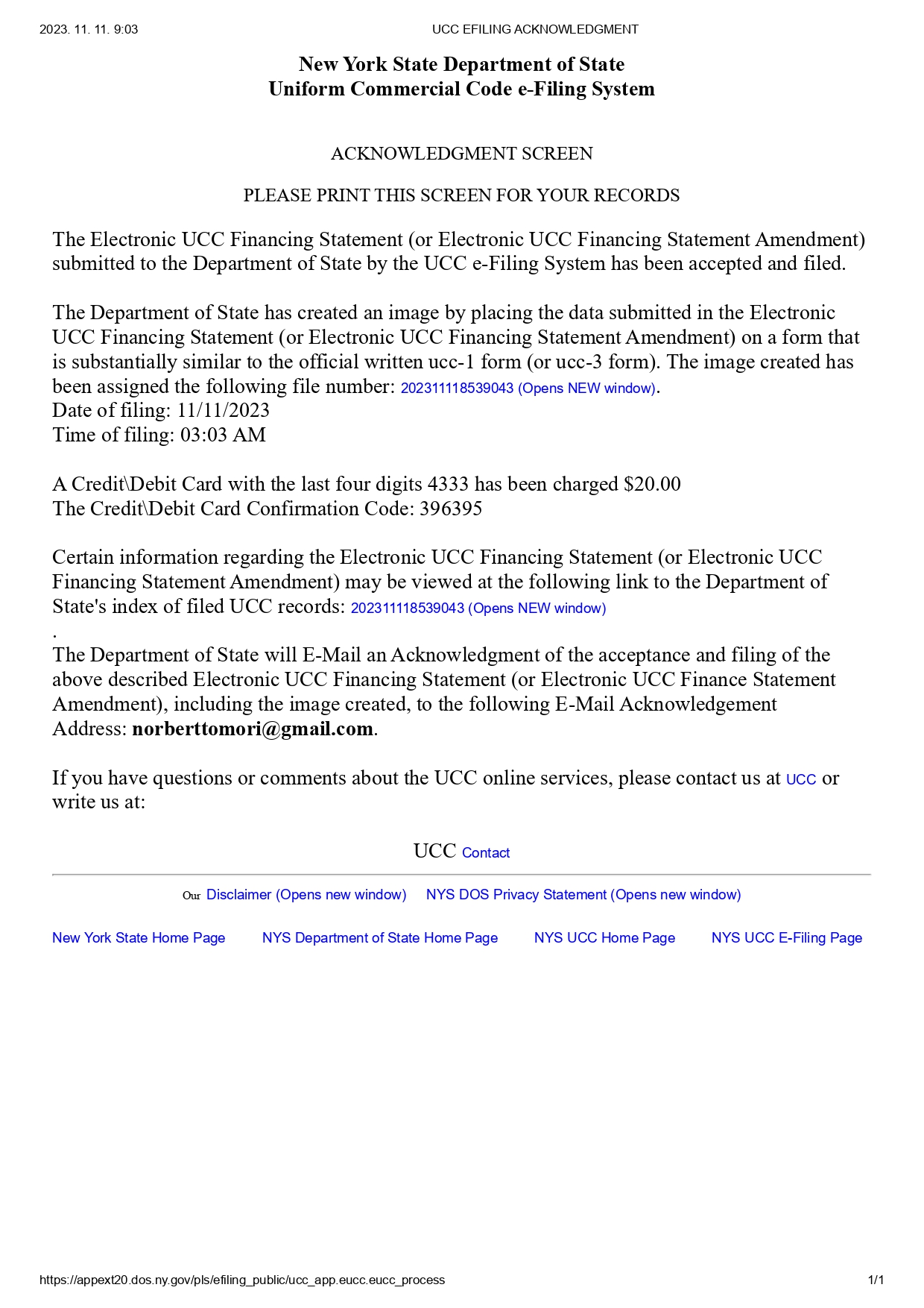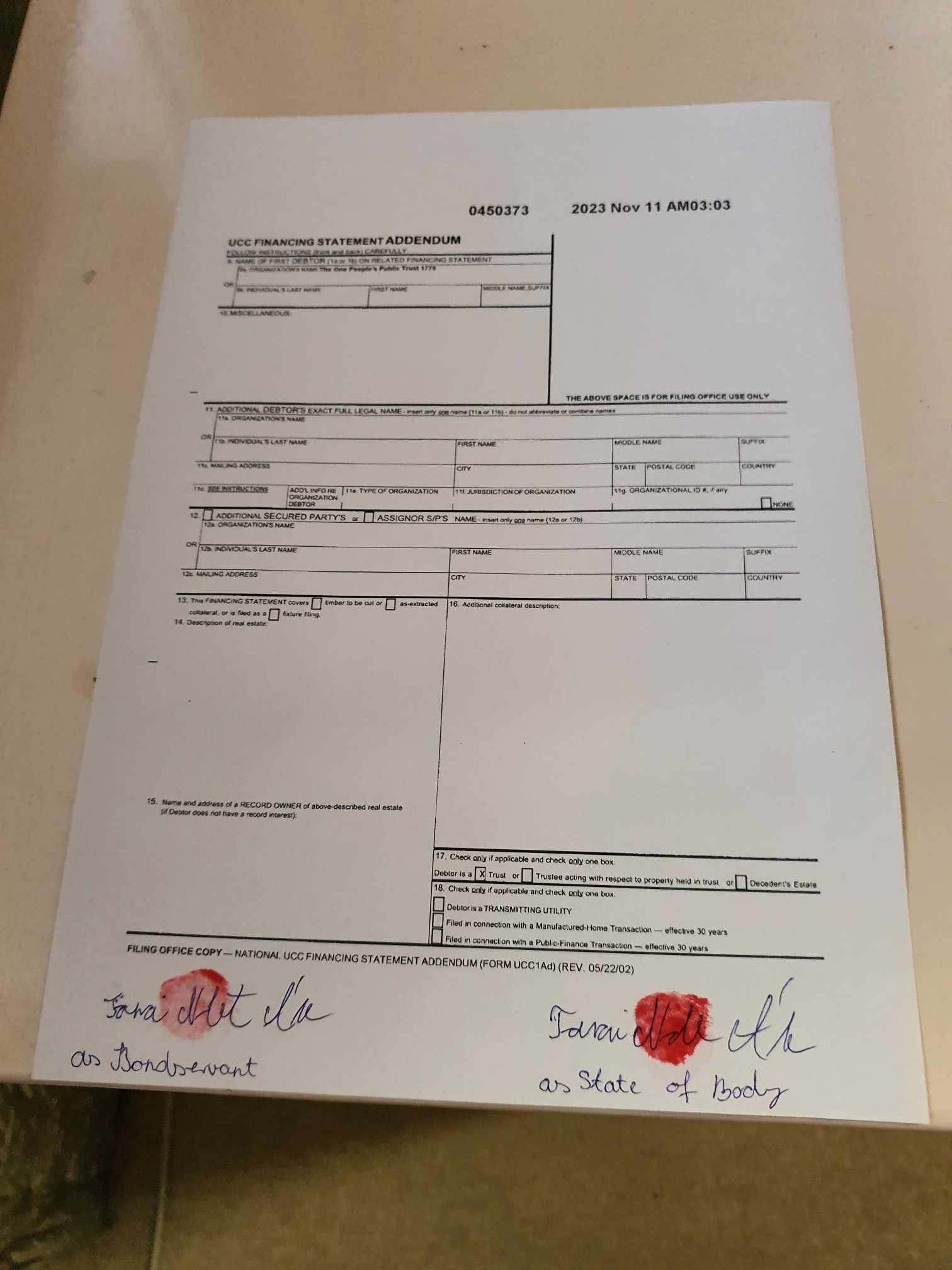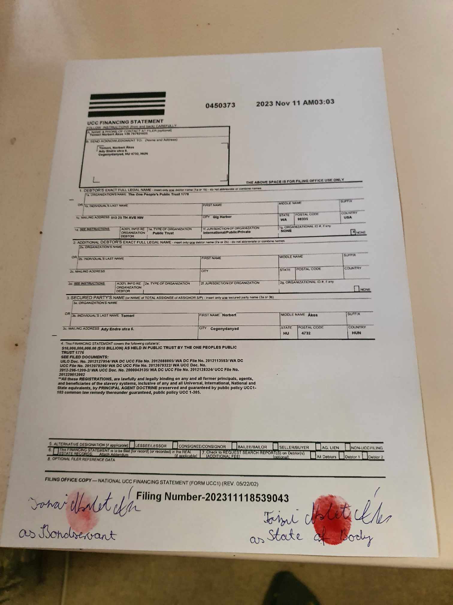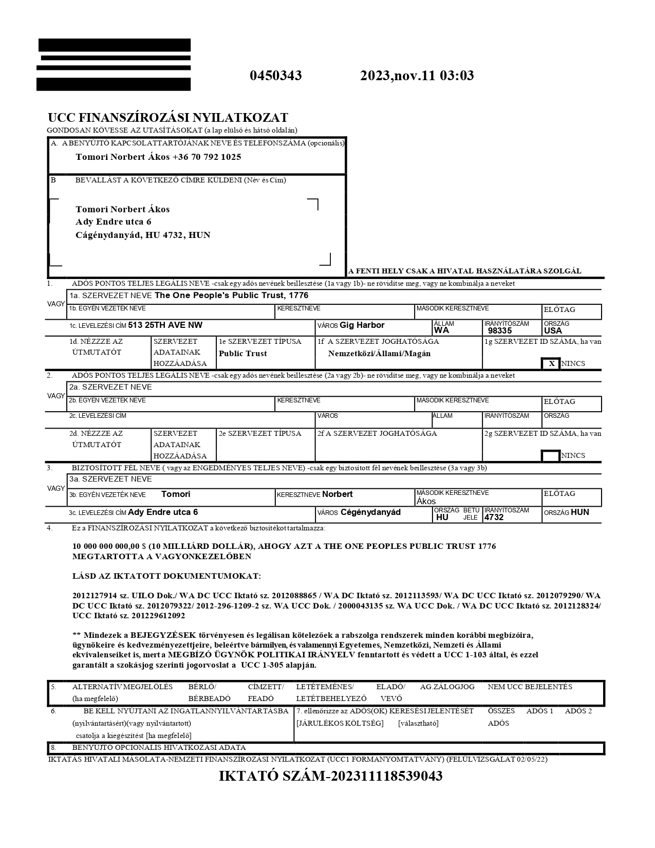 DC UCC nyilvántartási száma 2012079322, mely értesített a teremtéssel, törvénybe iktatott az értesítés